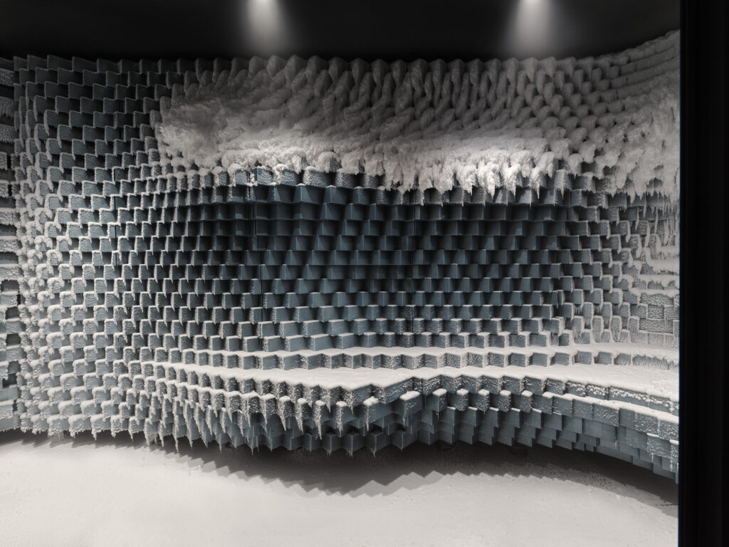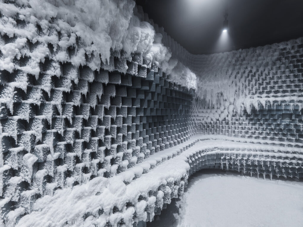 The Crystal Sauna is both an art installation and an actual sauna that can hold twelve people and is powered by a battery heater.