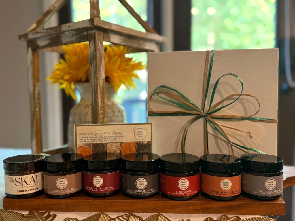 Each box includes: Golden Lakadong Turmeric – Rich in curcumin, this golden spice supports immunity and joint health; Natural Makhir Ginger – A zesty, aromatic variety native to Meghalaya, known for its digestive and anti-inflammatory benefits; Warm Wild Long Pepper – A rare spice offering a gentle heat and deep flavor, perfect for enhancing metabolism; Pure Perilla Pearls – Nutty, omega-rich seeds that nourish skin and support heart health; Aromatic 3Hills Cinnamon – Naturally sweet and antioxidant-rich, ideal for balancing blood sugar and adding warmth to your meals; Hillside Ghost Pepper – For the bold — adds intensity and vitality in every sprinkle; Skai Naturals Butter Cream – A rich, plant-based moisturizer that soothes and hydrates your skin.