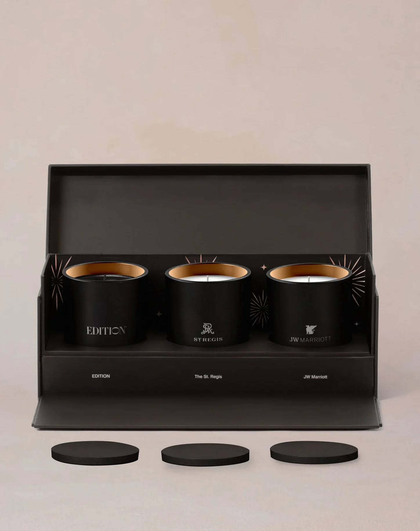 EDITION Hotels Candle: A bold and modern blend of robust black tea, citrus, smoke, chocolate, pepper, and floral notes. This signature scent embodies the EDITION brand’s sleek sophistication and cosmopolitan spirit.