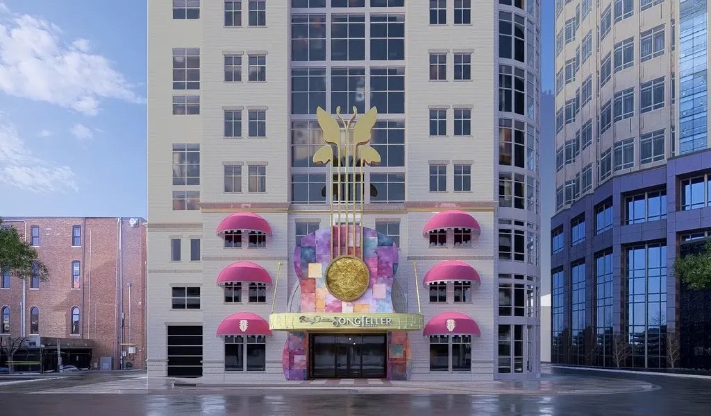SongTeller Hotel in downtown Nashville is scheduled to open in June 2026. Reservations are already open. Located at 211 Commerce St, Nashville, the 12-story hotel will offer 245 rooms, themed suites, and two live music venues, Parton’s Live and Jolene’s, which will host performances by local artists. An all-day cafe and a speakeasy are planned. The color palette is a stylish rainbow spectrum of jewel tones.