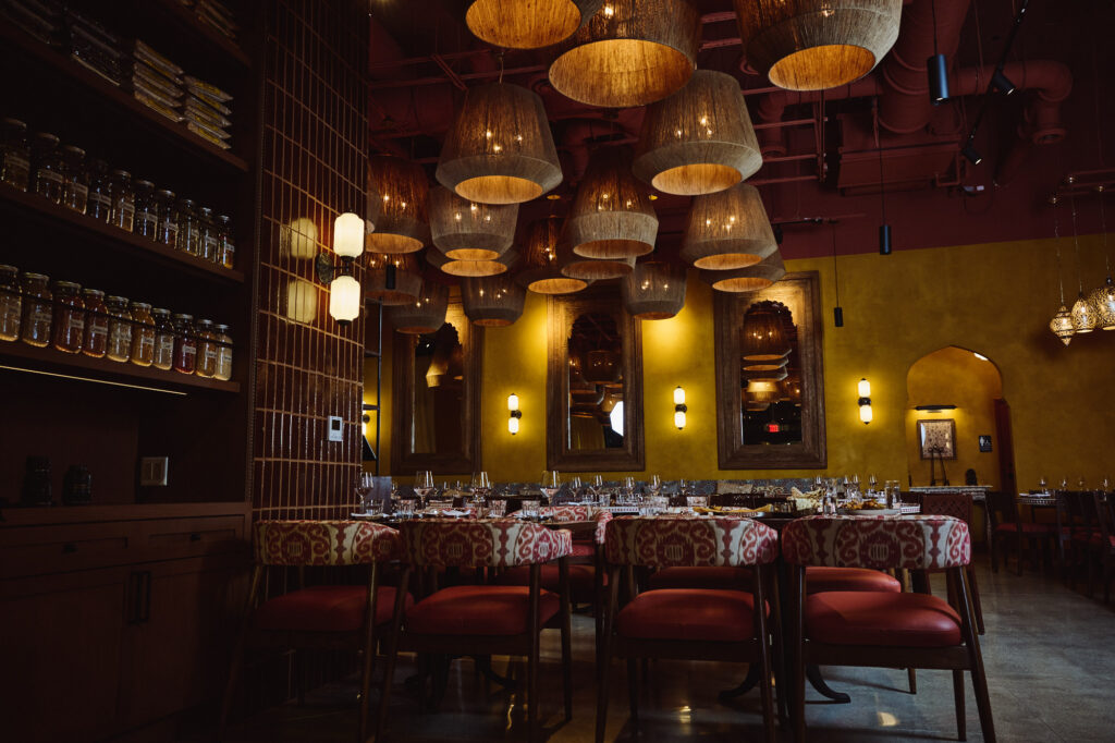 Ghee’s interior was designed by Alkassar, who took inspiration from his trip to India with Chef Patel. There, the duo crafted gorgeous, handmade furniture, including bone-inlay tables and shell-inlay mirrors. These complement a color palette dominated by yellow and terracotta, with accents of blue and green.