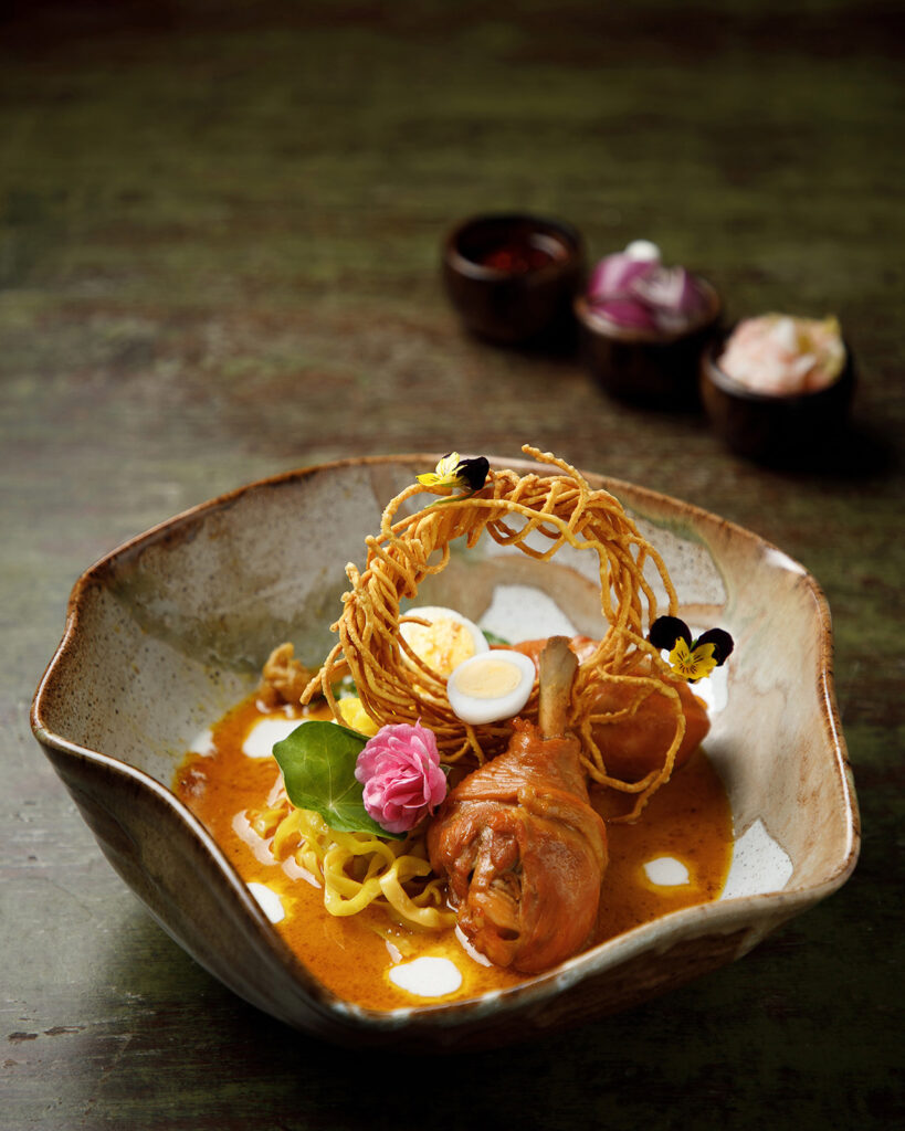 From hand-pounded curry-pastes to the pairing of herbs and aromatics, he tinkers tantalisingly with some centuries-old techniques. One dish that sums up his craft is the Khao Soi Gai, with its rich coconut gravy, soft egg noodles, and crisp fried noodles on top. “Much more than a dish, it is Northern Thailand in a bowl, where the aromas of street markets and family kitchens collide in a spectacular burst of flavor,” smiles the Executive Sous Chef.