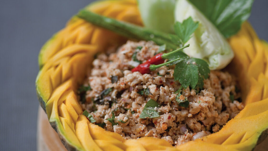This is where Thai Chef Instructor Suwattana Boonyarattananusorn shines. Leading the immersive cooking classes at Rim Tai Kitchen Cooking Academy, he invites guests to explore the rhythms of Thai culinary tradition. His signature dish, Larb Muang Moo, a vibrant Northern Thai salad with herbs, toasted rice, and a cornucopia of flavours is a masterclass in balance.