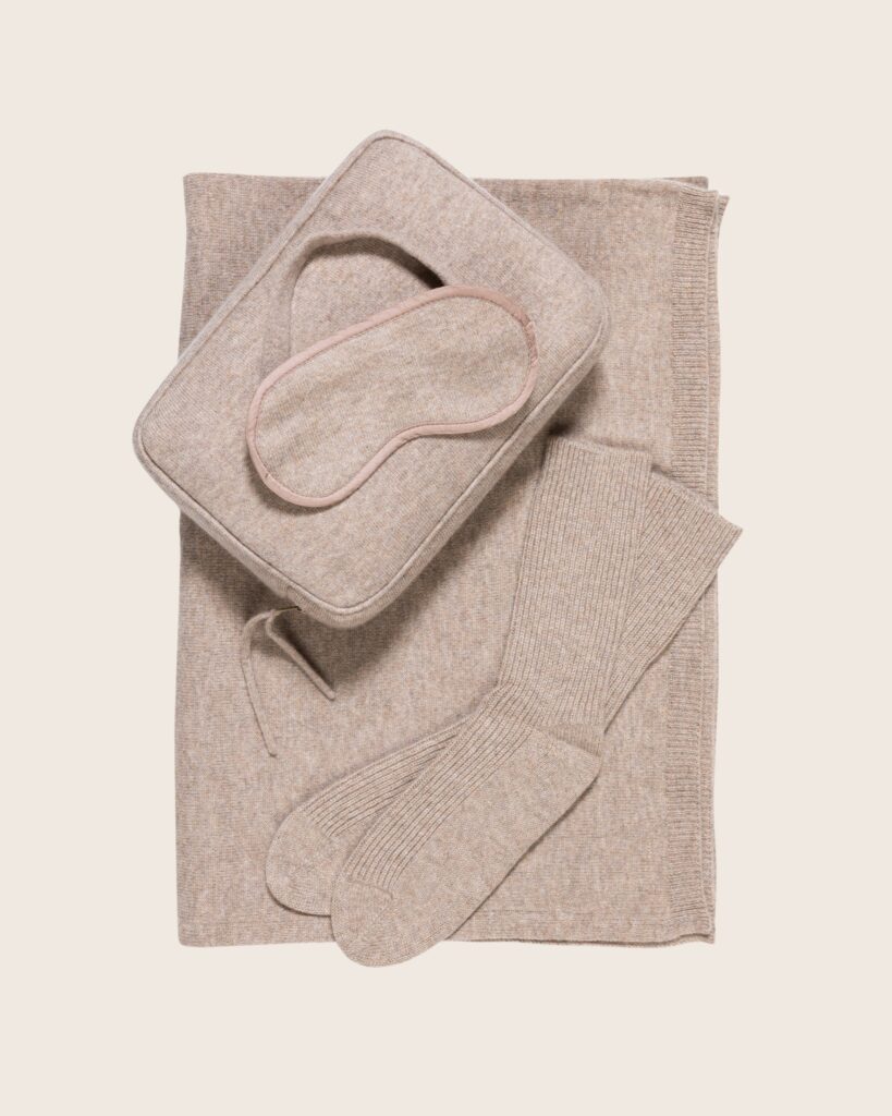 Elevate your travel experience with the Aviano Travel Set, designed to add comfort on any journey. Complete with a cashmere eye mask, blanket, socks, and a zippered bag to keep it all together, this set is the perfect companion for both short and long trips.