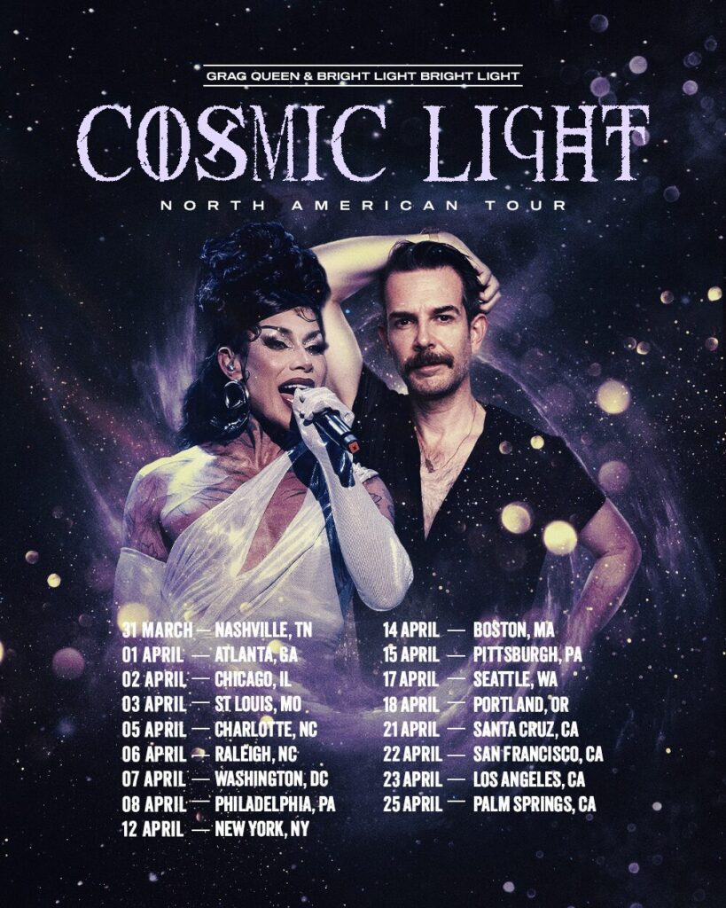 Grag Queen, singer, songwriter, and winner of drag queen singing competition Queen of the Universe, will be joined by Welsh electro-pop music artist and DJ Bright Light Bright Light for the Cosmic Light North American Tour, kicking off in Nashville on March 31. The tour aims to bring queer joy to 17 cities across the U.S., celebrating the community that these two artists are so proud to be part of and continue to uplift. This energetic cosmic adventure across North America features some of their biggest hits, including songs from Grag Queen’s 2025 album Cósmica and Bright Light Bright Light’s latest album Enjoy Youth.