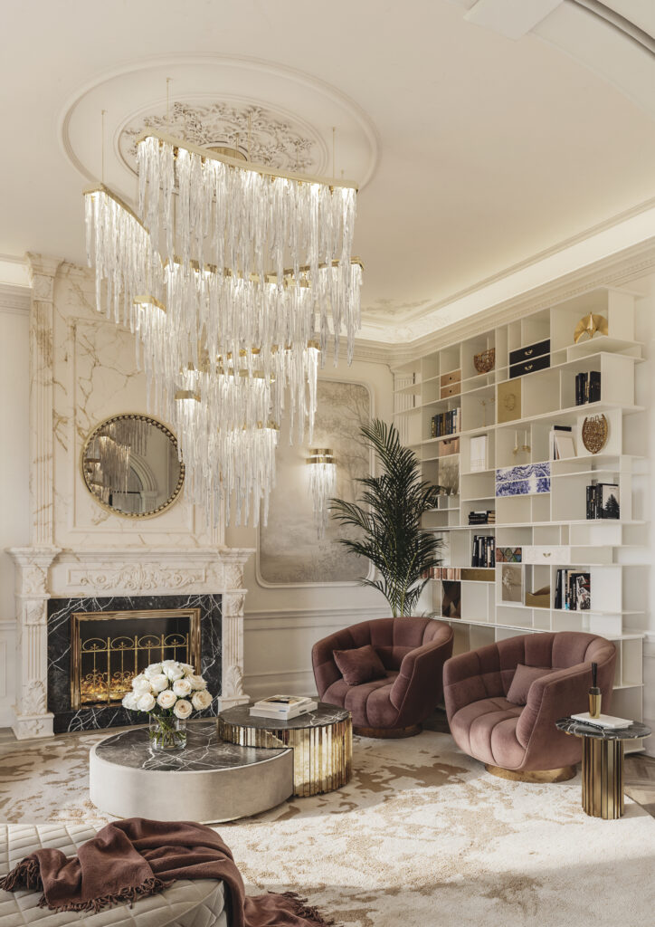 Bathed in natural light from soaring, floor-to-ceiling windows, the living room of this Parisian penthouse exudes effortless elegance. Ornate moldings frame the outstanding Babel lighting installation. What makes this lighting piece special is its frosted crystalline elements, set within a sculpted brass bar, creating a striking visual effect. Beneath this artwork rest the Senzu sofa and the Empire set I center table, a modern combination of neutrals and metallics. Then, LUXXU added a bit of color through its partnerships with Essential Home’s Essex armchair in burgundy velvet and the Pixel cabinet by Boca do Lobo in varied color tiles. Babel wall lamps adorn the walls, introducing a layer of sublime detail. Every element, from curated art to bespoke furnishings, makes the space feel effortlessly chic and quintessentially Parisian.