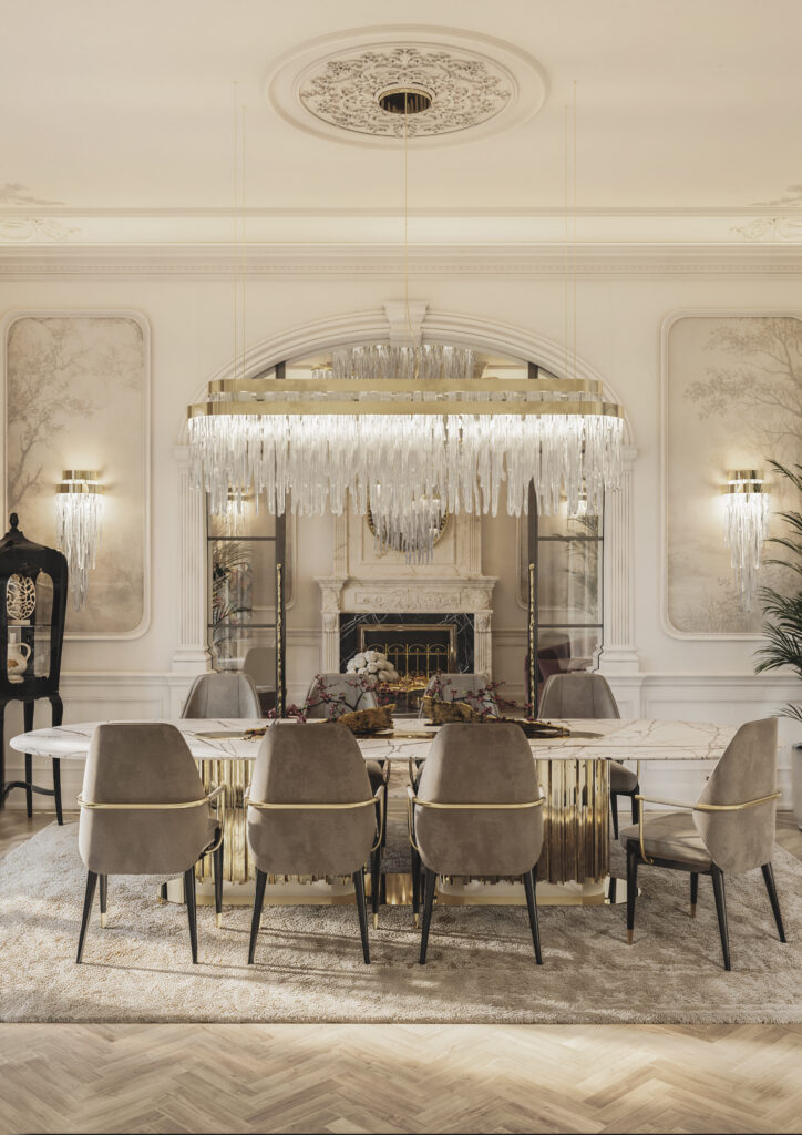This dining room perfectly captures the essence of haute living. Decorative ceiling moldings, tall windows, and soft natural light establish a timeless backdrop, while the framed view of the Eiffel Tower anchors the space unmistakably in the heart of the city. At the center, the sculptural Empire Oval marble dining table with a gleaming brass base and marbled top introduces a sense of modern opulence, complemented by the Algerone II dining chairs that offer both comfort and sophistication. The Babel suspension descends gracefully above, adding movement and luminosity, and the gold-rimmed Scala mirror and the lacquered wine-toned Lapiaz sideboard extend the room’s interplay of texture and sheen. This is a definitive expression of LUXXU’s commitment to elevated living.