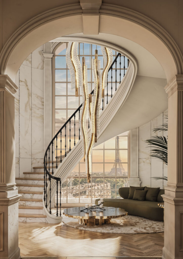 The entryway embraces a classical spirit, offering an environment that balances openness with intimacy. Chevron parquet and marble accents set the stage for the grandeur of the Liwave chandelier, presented in towering dimensions. Its sinuous silhouette, crafted from polished brass and clear crystal, mimics the rhythm of waves frozen mid-flow. This welcoming area feels both ceremonial yet intimate, a refined transition into the home’s modern luxury.
