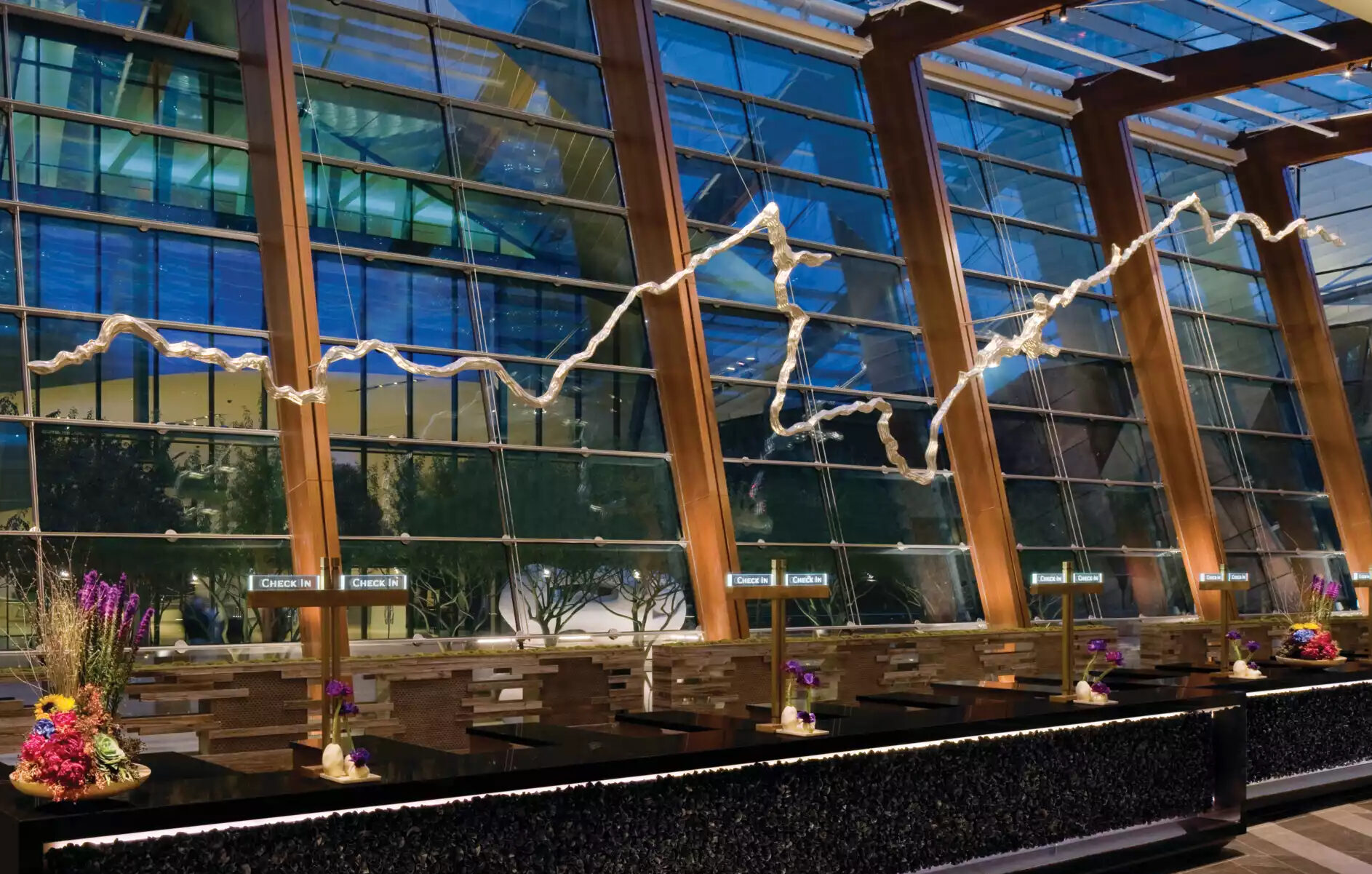 For example, the ARIA Resort & Casino features a large public art collection with works by Maya Lin, Jenny Holzer, Frank Stella, Nancy Rubins, Claes Oldenburg and Coosje van Bruggen, and Henry Moore. The collection is integrated throughout the resort and includes paintings, sculptures, and large-scale installations, such as Lin’s “Silver River” sculpture, which is right over the reception desk, and Oldenburg and van Bruggen’s “Typewriter Eraser, Scale X” and much more, often in surprising locations.