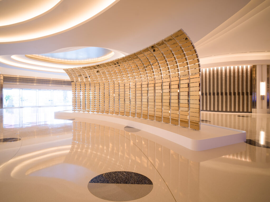 Oceans: Interactive kinetic sculpture featuring a single arch that mimics ocean tides gathered from global data, merging marble and brass-tinted steel with dynamic “brixels.” Stop and watch a while and see how the pieces move. It’s a reminder of the link between natural rhythms and our own busy behaviors. Of course, the gold color will have you manifesting luck during your stay.