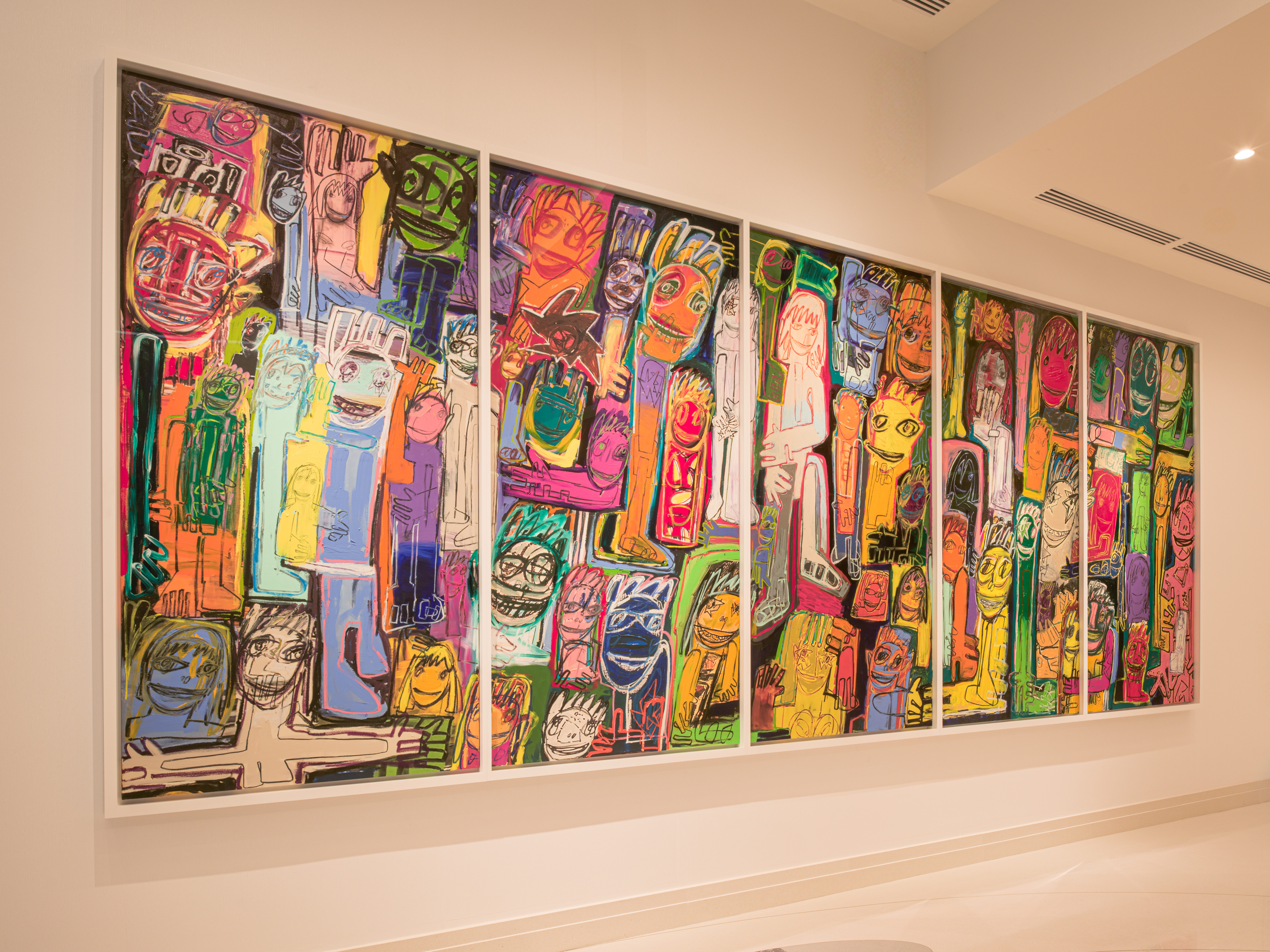 Untitled, 2018 – 2019: Multi-colored sketch-like figures using oilstick, acrylic, charcoal, and ink jet, providing a satirical take on American culture. Also known as “High Times,” the five-panel piece has an irreverence that is appealing.
